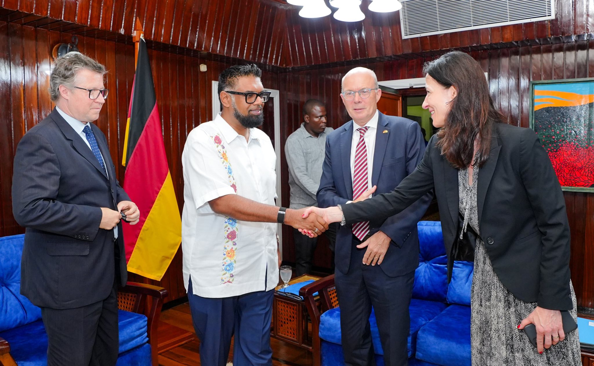 President Dr Irfaan Ali today met with Deputy Director‑General of the European Union (EU) Investment Bank, Mr Martin Seychell, and the Bank’s representative for the Southern and Eastern Caribbean, Ms Maria Rojas Gonzalez, at the Office of the President on Shiv Chandrapaul Drive.